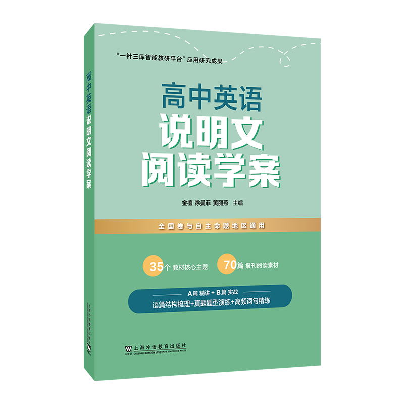 说明文作为一种常见的学术类体裁,是高中英语阅读教学的重要组成部分。研究发现,由于说明文结构复杂、术语晦涩、信息密集,学生在理解过程中常感吃力。为提升学生说明文阅读素养,我们依照新课标与新高考评价体系的要求,采用语料库智能技术,研制了《高中英语说明文阅读学案》。本书由师范大学教授团队与一线高中教师合作编写,遵循“主题—语篇一任务—语言”一体化设计思路,致力于提升学生在真实语境下的语篇理解能力与策略运用水平。
