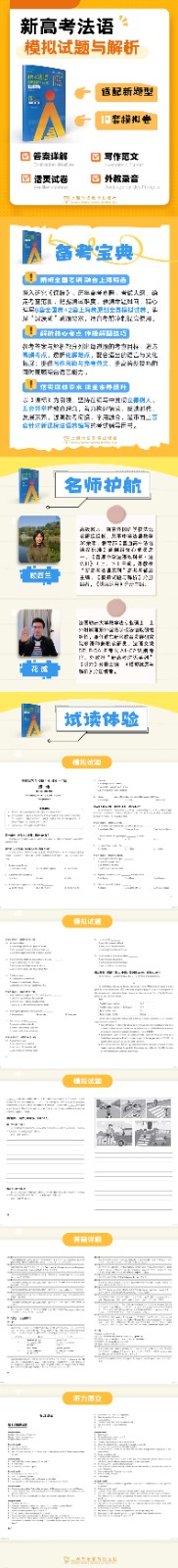“新高考法语系列”以《普通高中法语课程标准》为指导,以新高考改革理念为引领,以普通高校人才选拔要求为依据,紧紧围绕《课标》要求确定考查范围和难度,着力培养学生的法语运用能力。编写团队全面分析近年高考法语真题,研判考点分布和命题趋势,设计与真题难度相当的专项训练与模拟试题,坚持在编写中贯彻立德树人、五育并举的教育理念,为法语学生提供翔实、有效、高质量的备考资料。