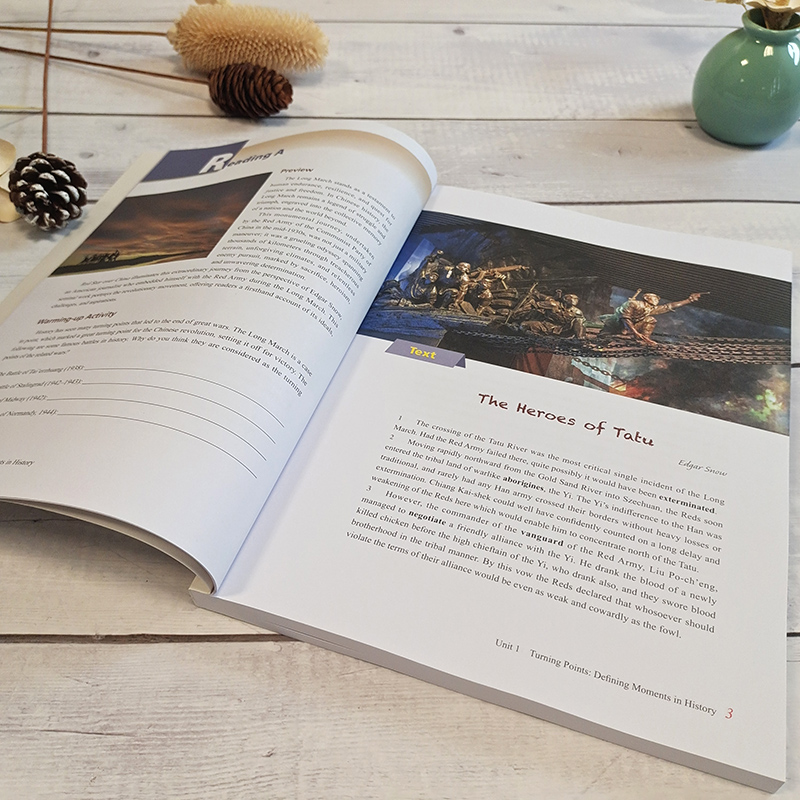 在结构设计上,本教程分为八个单元,每个单元都围绕一个特定主题展开,包括历史转折点、影响力人物、艺术与文化欣赏、多元习俗与传统、地理与旅行探索、生活万象、人文与自然科学的融合以及中国的全球足迹等。这些主题不仅涵盖了广泛的知识领域,承载着丰富的知识与深刻的思考,更是将中国元素融入教学中,让学生在培养语言技能、批判性思维和创新能力的同时深入了解中国的历史、文化和社会,进而在全球语境中定位自己的文化与身份。