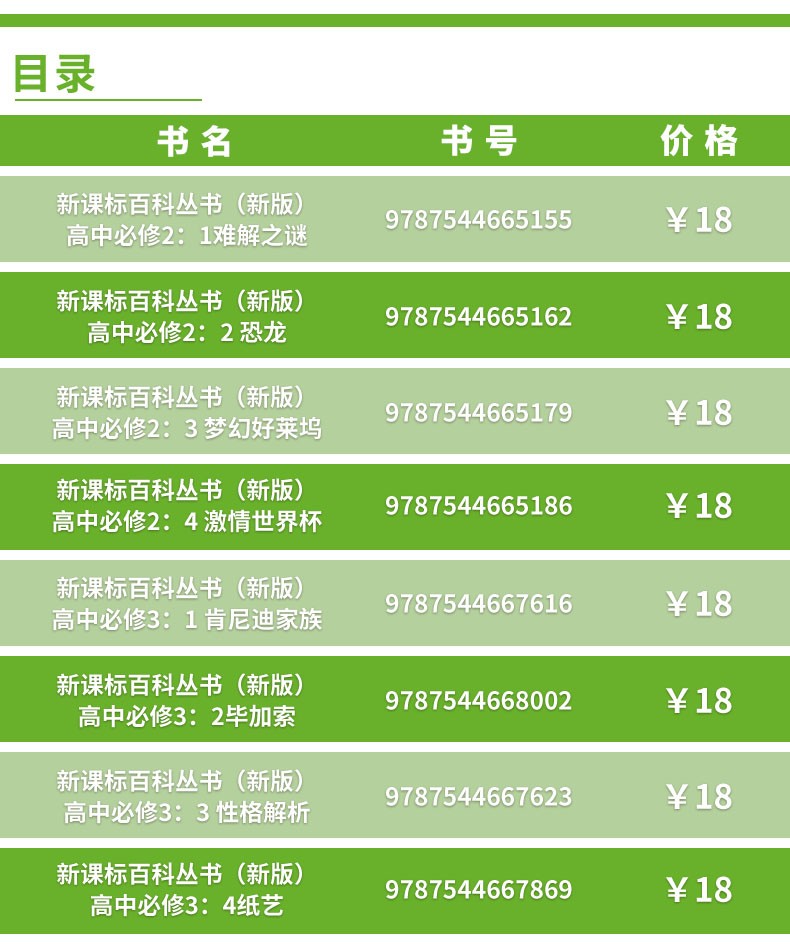 “外教社-朗文中学英语分级阅读”《新课标百科丛书》(新版)高中部分以教育部《普通高中英语课程标准》(2017年版)为依据,针对高中必修和选择性必修阶段的英语学习要求编写,以英语学科核心素养培养为目标,引导学生自主阅读、主动探究,通过整本书阅读形成阅读素养。