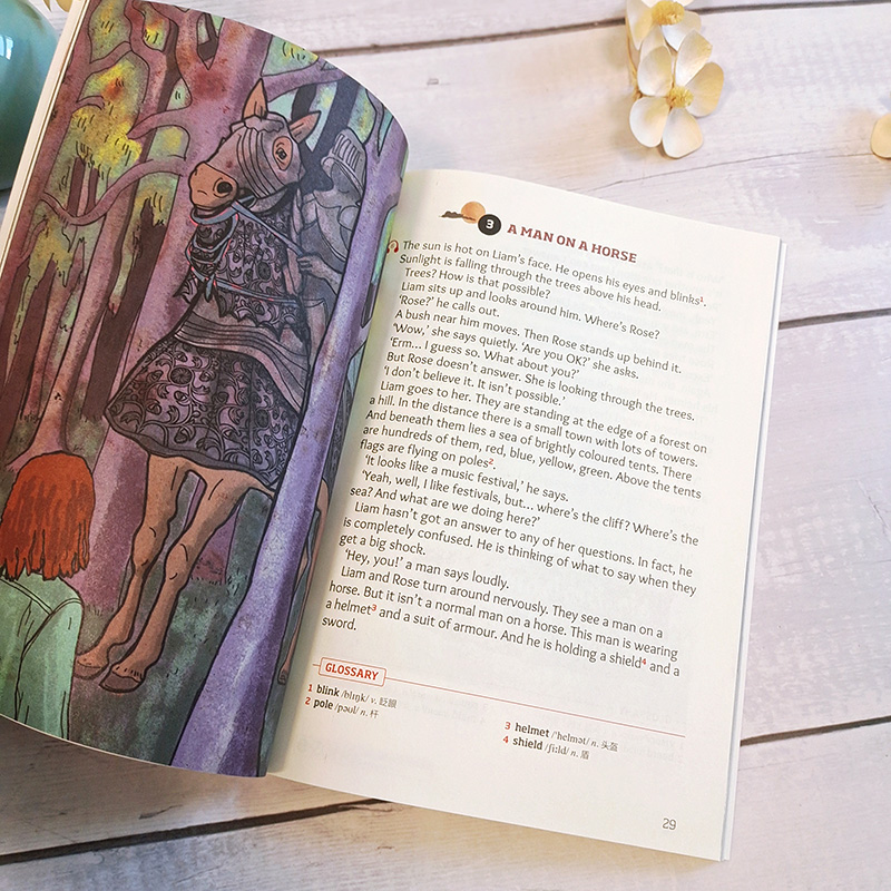 全系列每册读物均设置了丰富的读前、读中和读后练习。读前练习用于帮助读者预习,以熟悉故事中出现的词汇、句式、人物及文化现象等;读中练习在故事叙述中随机出现,或可增进读者与故事的互动,或可加深读者对故事内容的理解,或可引导读者思考故事进一步的发展等;读后练习用于帮助读者理解故事的主要内容、概括主题和中心思想、对主要人物及其性格做简要评价,并梳理读后感等,还提供了与图书内容相关的语言技能训练和测试来帮助读者巩固语言学习。“黑布林英语阅读”系列格外重视学习者对英语词汇的学习和积累:小学段读物每册故事后均提炼出与故事内容相关的主题词汇及知识点讲解,初中段和高中段读物则在正文页脚位置或在读后练习之后对故事中的重、难点单词给予词性、音标以及汉语或英汉双语的词义注释。