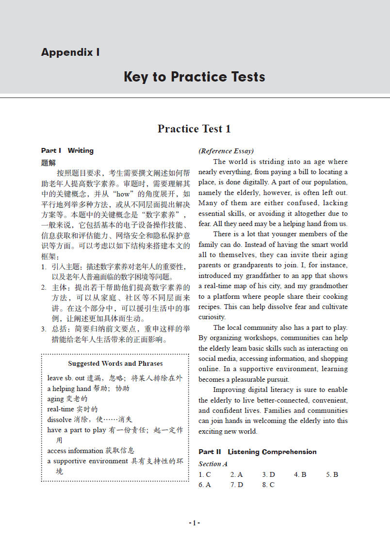 新修订的试题集包含8份完整的模拟试题,并在答案附录部分提供详实的参考答案和题解注释。如在“写作”和“翻译”部分的注释中,我们提供了可参考的写作思路和可采用的词语和句型。