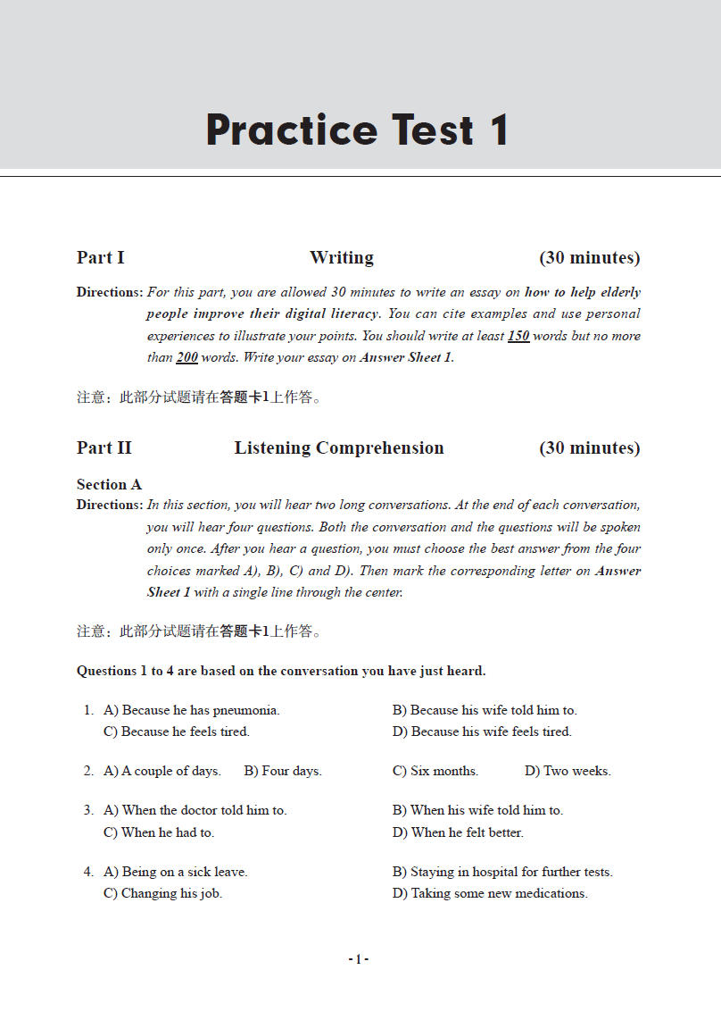第二试项“听力理解”(Listening Comprehe nsion)包含三种题型:长对话(Long Conversations)、听力篇章(Passages)和讲座/报道/讲话(Lectures/Talks)。在选材上,此次修订延续了本试题集传统上的时代性、趣味性和实用性特点,还特别强调兼收并蓄,展现中国乃至世界各国的丰富文化和社会现实。