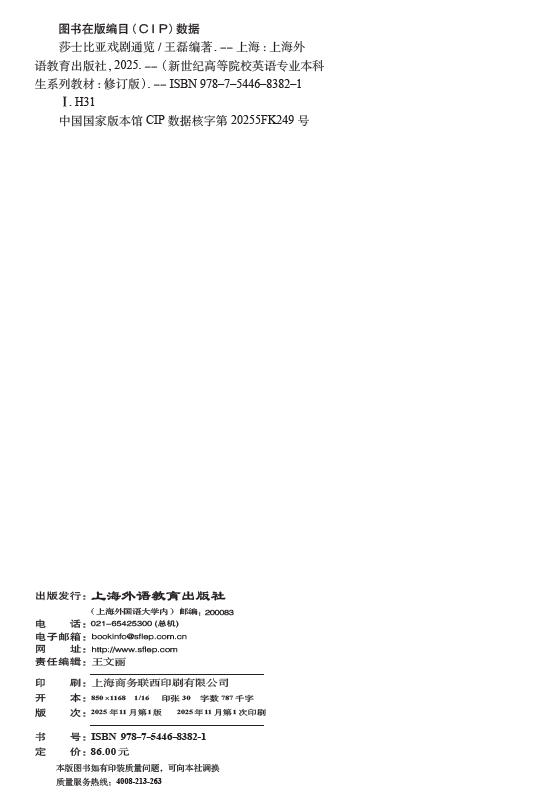 本书按照喜剧、历史剧和悲剧的顺序收录莎翁全部戏剧作品,每部分之前设An Overview(概览),对该体裁莎翁戏剧做简要介绍。随后各章围绕莎士比亚38部剧作设计如下栏目: I.Points of Departure(导读):介绍剧作的背景、主题及值得关注的部分; II.Play Synopsis(剧情梗概):以流畅的现代英语和适当嵌入的剧中精彩语句介绍剧作的主要情节; III.Savoring Shakespeare(莎剧品鉴):摘录剧中最著名的选段或完整场景,结合详细的注解和理解思考问题,帮助读者体味莎剧的魅力; IV.Shakespearean Spin-offs(莎剧关联):通过A. Shakespeare as Wordsmith,B. Shakespeare in Literature,C. Shakespeare Visual and Audial三个栏目,帮助读者了解莎剧的影响; V.Useful Resources(推荐阅读):列出与该剧相关的主要阅读文献,为读者进一步探究提供参考。 书后附录为俗语清单,方便读者学习莎翁戏剧中出现过的、且在现代英语中仍广泛使用的妙语箴言。