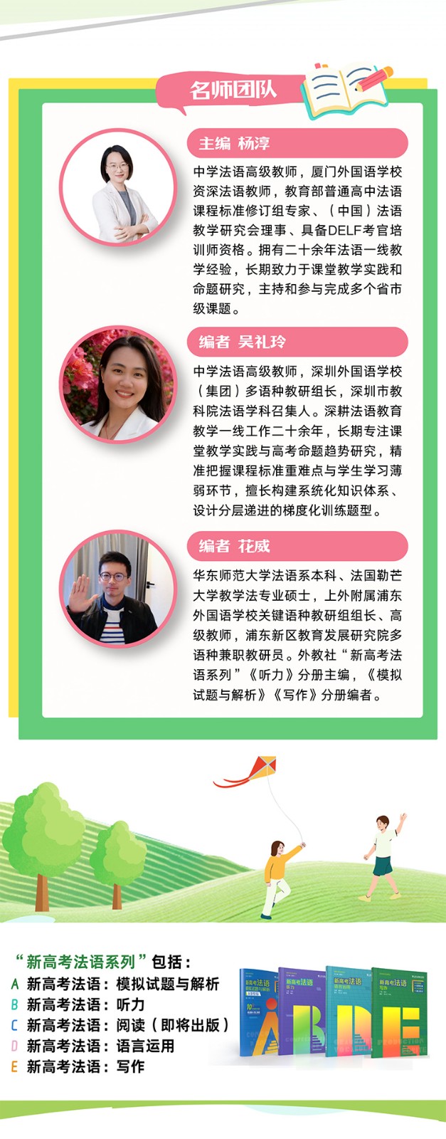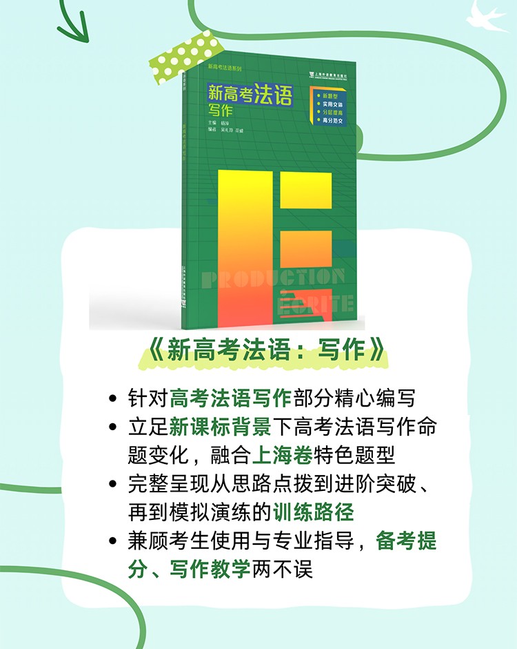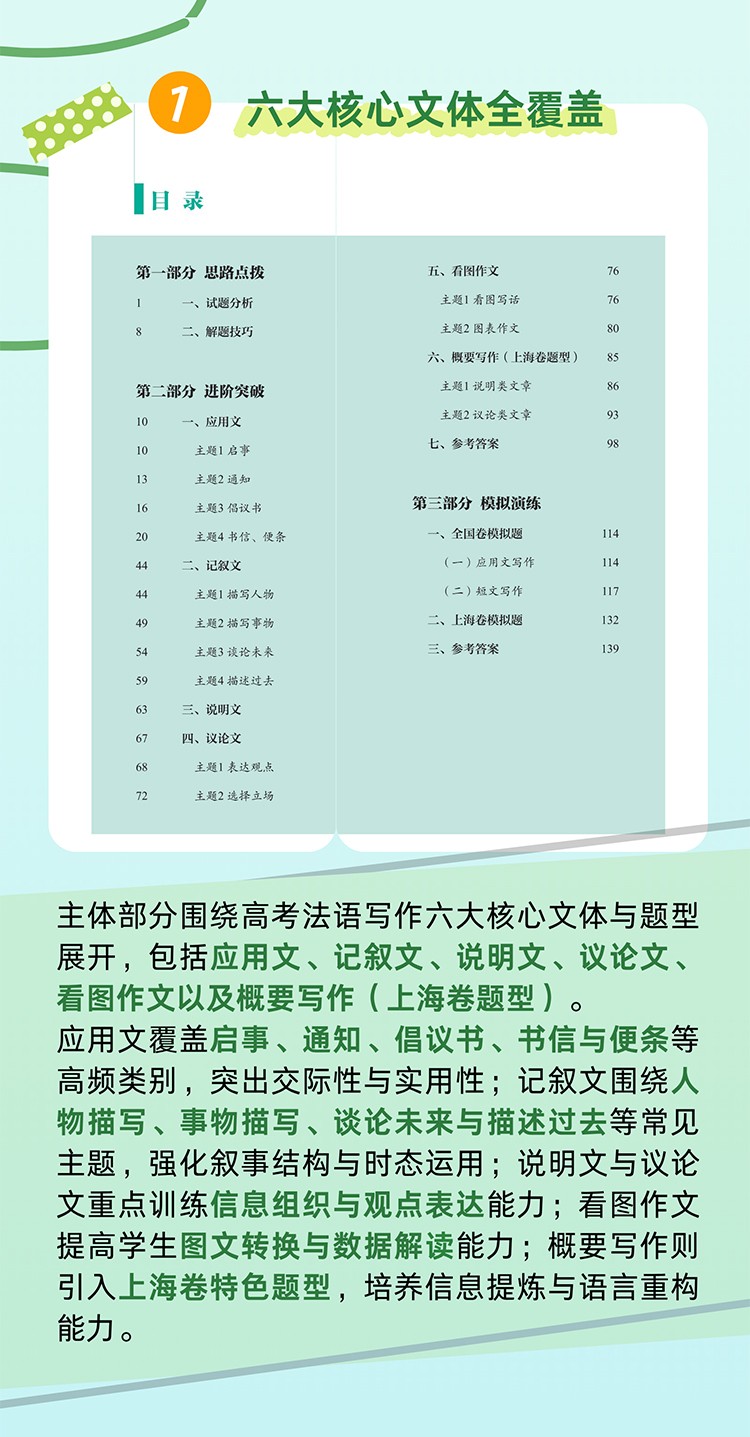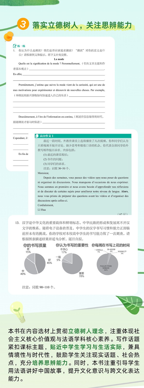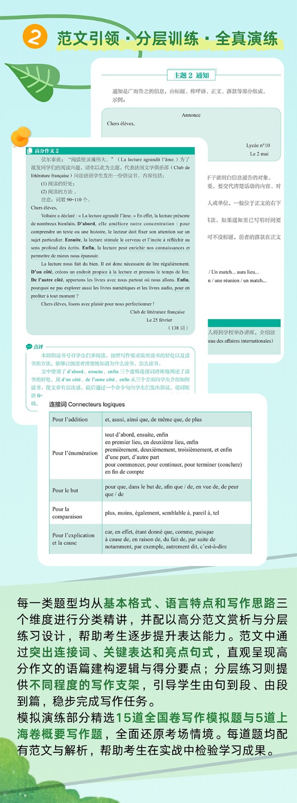 本书是“新高考法语系列”的写作分册,全书包含思路点拨、进阶突破和模拟演练三个部分,并附有练习答案及解析。思路点拨部分整理了近十年来全国高考作文题,根据课标提供评分标准参考,分析命题趋势。进阶突破部分主要讲解应用文、记叙文、说明文、议论文、看图写作和概要写作六种题型的基本格式、语言特点和写作思路。既提供例文作为赏析提高,又提供分层练习进行重点突破。模拟演练设置20道全国卷和5道上海卷的作文模拟题,每道写作题均附有例文。